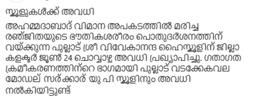 അഹമ്മദാബാദ് വിമാന അപകടത്തിൽ മരിച്ച രഞ്ജിതയുടെ ഭൗതികശരീരം പൊതുദർശനത്തിന് വയ്ക്കുന്ന പുല്ലാട് ശ്രീ വിവേകാനന്ദ ഹൈസ്കൂളിന് ജില്ലാ കളക്ടർ ജൂൺ 24 ചൊവ്വാഴ്ച അവധി പ്രഖ്യാപിച്ചു. ഗതാഗത ക്രമീകരണത്തിന്റെ ഭാഗമായി പുല്ലാട് വടക്കേകവല മോഡല്‍ സര്‍ക്കാര്‍ യു പി സ്കൂളിനും അവധി നൽകിയിട്ടുണ്ട്.